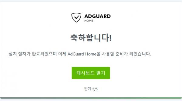 대시보드열기를 눌러 마무리하면 AdGuard Home의 서버설치가 마무리됩니다.