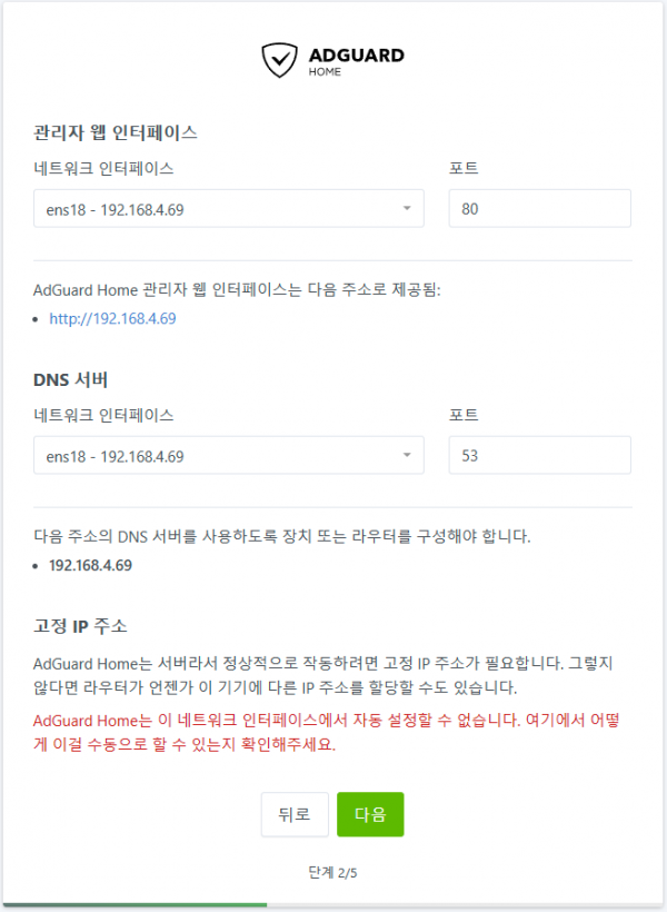 위의 웹인터페이스는 애드가드 서버의 관리자페이지세팅입니다. NIC가 여러개라면 특정 NIC의 아이피주소를 설정하고 포트설정이 가능합니다. 어짜피 NPM으로 넘길꺼기때문에 포트는 80번으로 그냥 유지합니다.