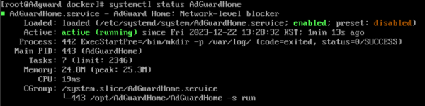 이후에 AdguardHome 서비스가 정상실행중인지만 확인해주시면 설치는 끝입니다