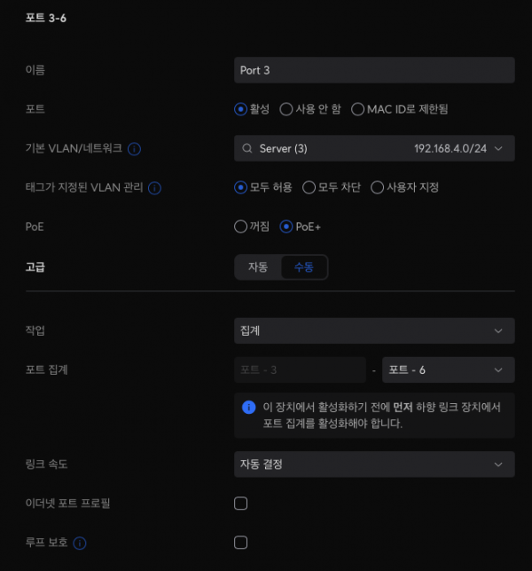 unifi의 설정창에서 현재 Proxmox와 연결되어있는 포트중 제일 앞의 숫자를 선택해줍니다.