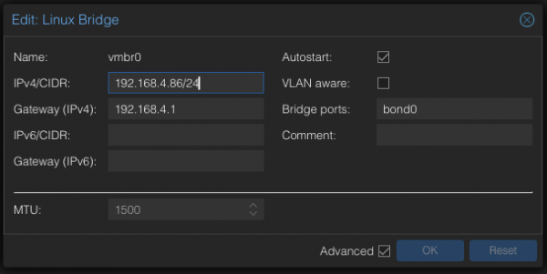 여기에서 이제 사용할 ip와 게이트웨이를 넣어주시고 브릿지포트부분에 "bond0"를 넣어줍니다.