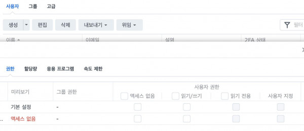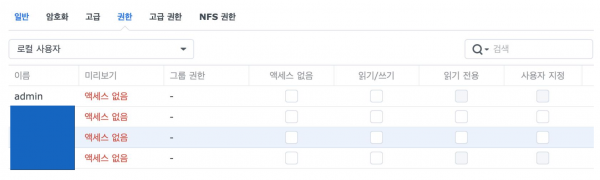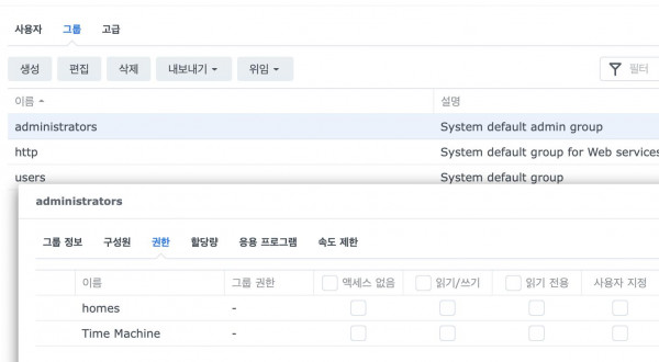 특정계정은 homes폴더를 쓰고싶다하면 그룹 말고 사용자권한에서 읽쓰 체크해주시면됩니다.