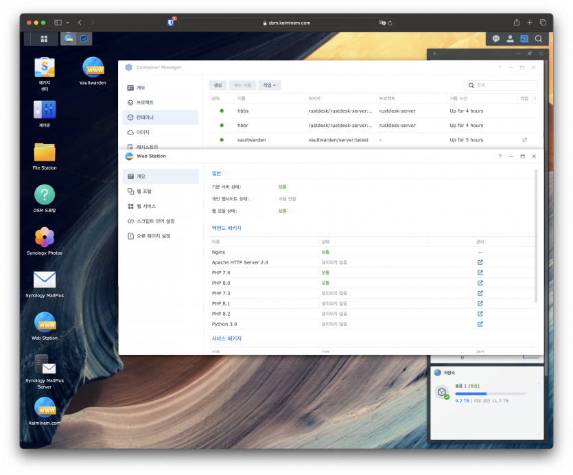 여름 전기사용량도 그렇고 서버의 자원이 너무 낭비되고 있는것같아 시놀로지에 모두 통합하였습니다.