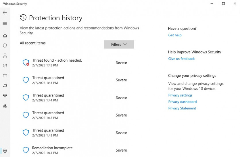 기본적으로 모든 악성 항목은 자동으로 격리된다. 윈도우 시큐리티는 보호 기록(Protection history)을 통해 모든 위협의 이력을 추적한다. 새로운 항목, 격리된 항목, 제거된 항목을 보고, 보안을 강화하기 위해 활성화하거나 구성해야 하는 설정에 대한 권장 사항도 볼 수 있다.