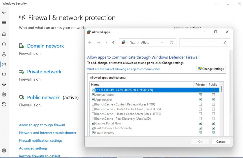 내장된 방화벽은 도메인, 사설 네트워크 및 공용 네트워크에 대해 자동으로 활성화된다. 특정 앱이 사설 또는 공용 네트워크를 통과하도록 간단히 허용할 수 있다. 또한 스냅인 모듈을 통해 고급 방화벽 설정에 들어가 기존 규칙을 수정하고 새 방화벽 규칙을 만들 수도 있다.