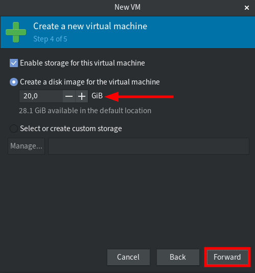 5. 가상 머신의 디스크 크기를 선택하고 "앞으로"를 클릭합니다.