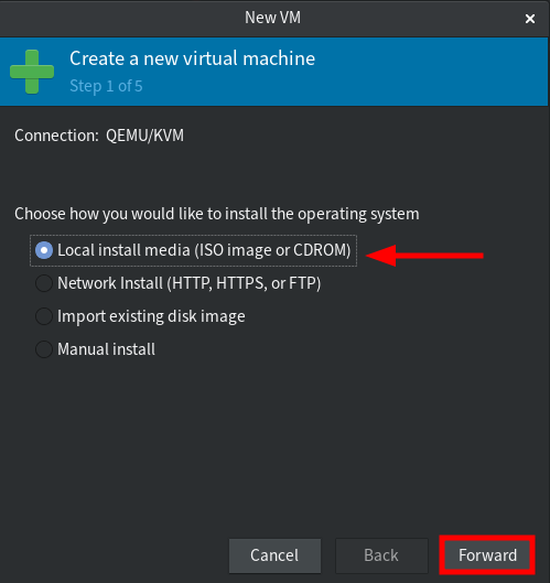 2. 설치에 ISO 이미지를 사용하려면 "로컬 설치 미디어"를 선택하고 계속하려면 "앞으로" 버튼을 클릭하십시오.