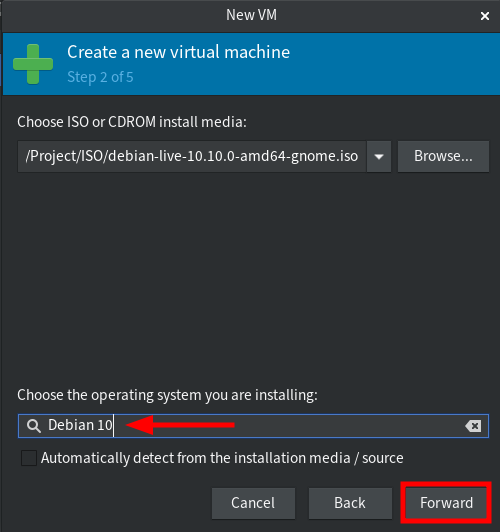 "설치 미디어/소스에서 자동으로 검색" 옵션을 선택 취소하고 설치하려는 운영 체제(이 예에서는 "Debian 10")를 입력한 다음 "앞으로" 버튼을 다시 클릭하여 계속합니다.