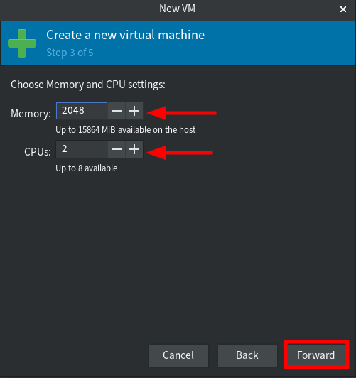 4. 가상 머신의 메모리 및 CPU 양을 선택한 다음 "앞으로"를 클릭합니다.