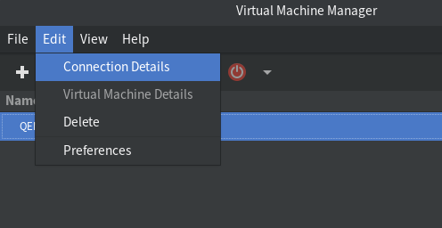 1. virt-manager 애플리케이션에서 "Edit -> Connection Details" 메뉴를 클릭합니다.