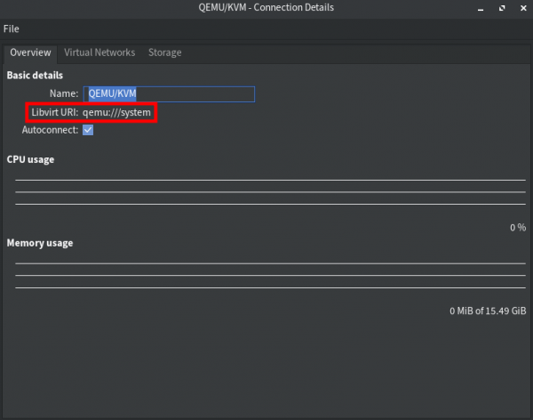 2. 개요 탭에서 virt-manager가 qemu:///system에 자동으로 연결되는 것을 볼 수 있습니다.