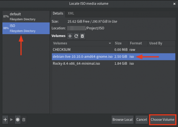 이제 풀 저장소 "ISO"를 선택하고 설치를 위한 iso 파일을 선택한 다음(이 예에서는 "Debian 10") "볼륨 선택"을 클릭합니다.
