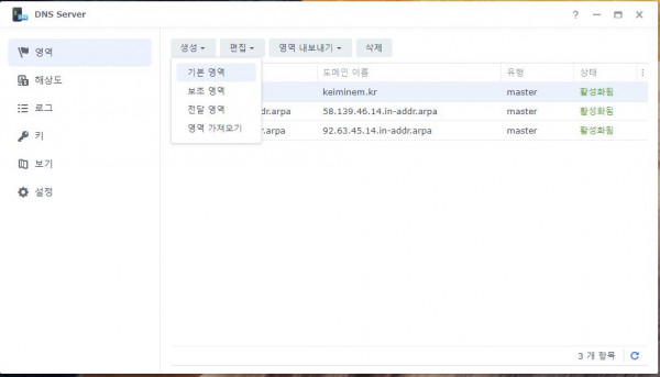 우선 도메인서버 어플에서 생성-기본영역 을 생성해줍니다.